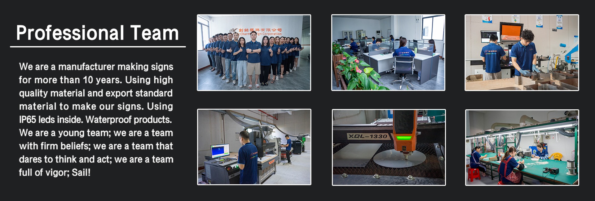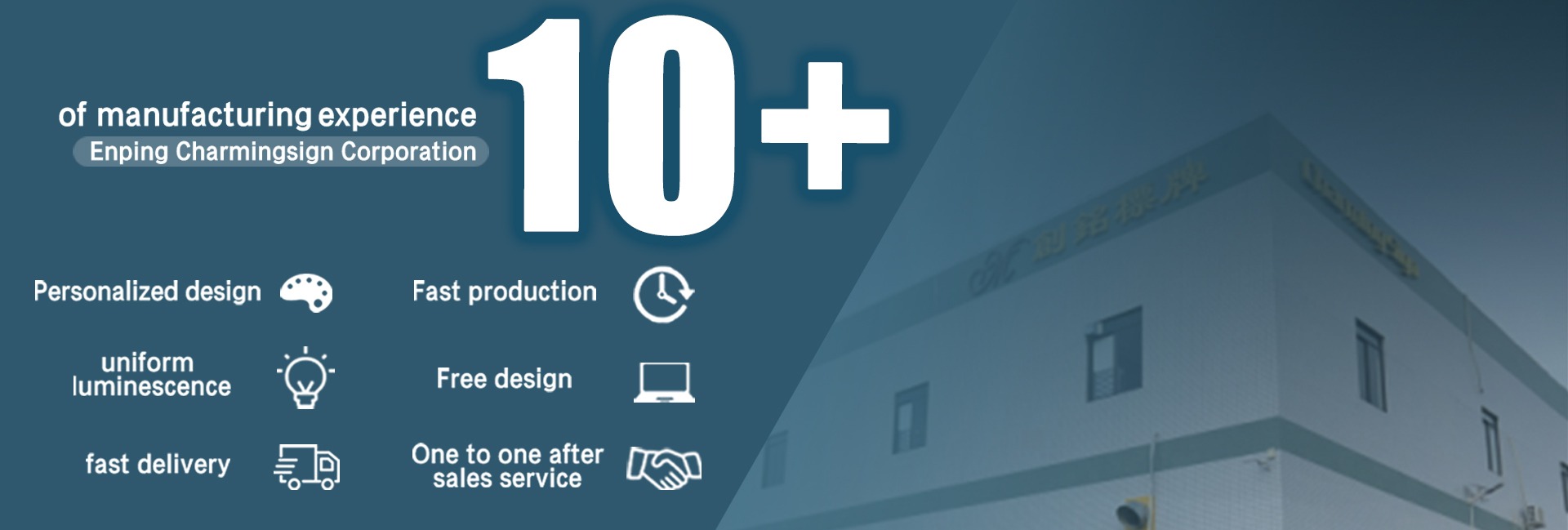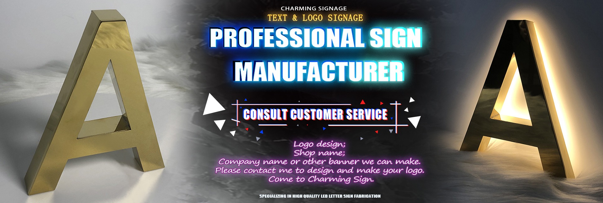 Charming Signage is a LED signage manufacturer factory, having more than 15years of business experiences at domestic and abroad market. The variety of our products include: LED Acrylic Letters,LED Aluminum Letters,LED Stainless SteelLetters,Front-lit LED Sign,Back-lit LED Sign, Edge-lit LED Sign,Side-lit LED Sign,etc.